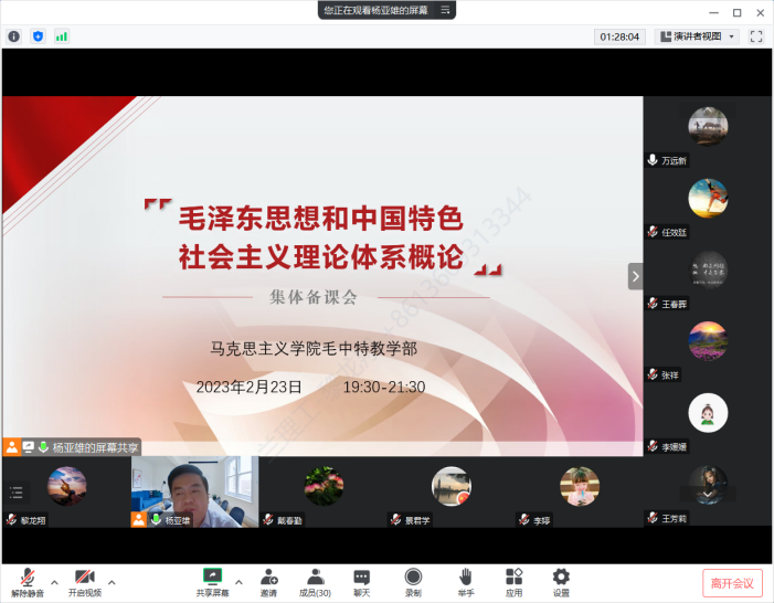 为深入学习贯彻党的二十大精神,推进党的二十大精神和习近平新时代中国特色社会主义思想及时、准确融入思政课教学,结合新学期新的教学要求和特色,2月23日晚,《毛泽东思想和中国特色社会主义理论体系概论》教学部通过腾讯会议组织开展集体备课。集体备课会由概论课教研室主任杨亚雄主持,教研室全体教师参加会议。