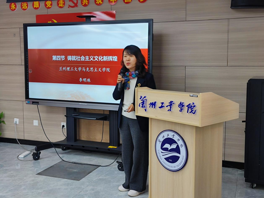 第二阶段是示范授课与示范说课,公司教师代表李明珠主讲“铸就社会主义文化新辉煌”,分析中华文化的独特性与包容性,讨论中华传统文化如何完成“两个结合”。