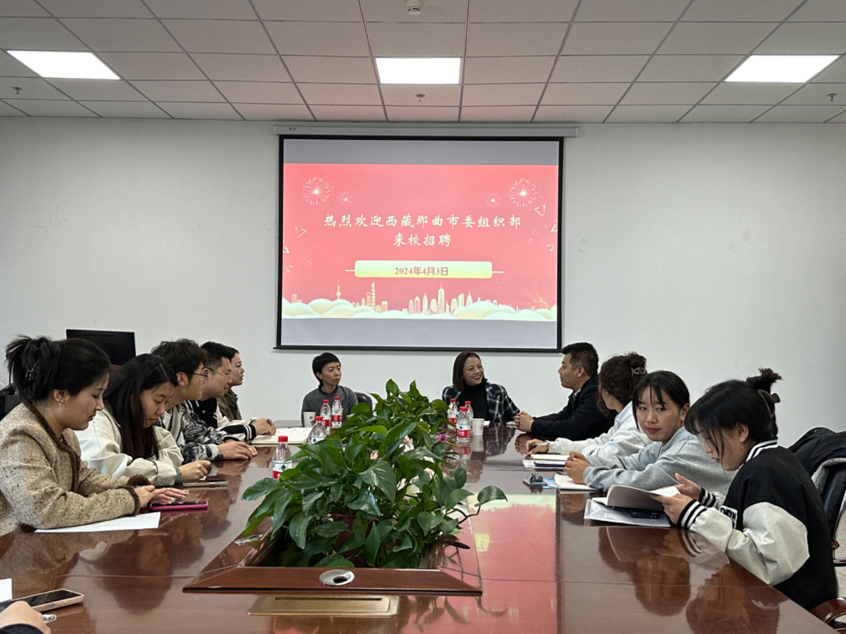 陈晓亮向那曲市委组织部来校招聘表示热烈欢迎,并根据公司招生、培养、毕业生生源和就业情况做了介绍。招聘现场,那曲市委组织部招聘负责人向在座毕业生播放了那曲市宣传纪录片,并就岗位需求,工资待遇和发展空间详细做了介绍。