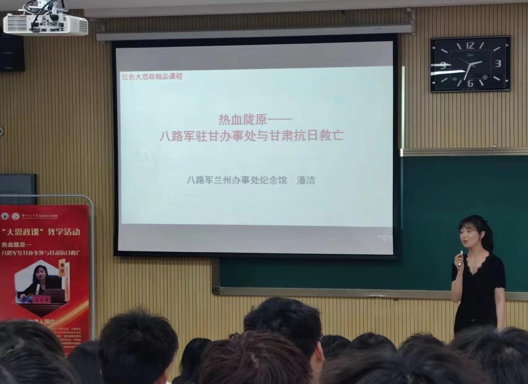此次“大思政课”教学活动邀请了八路军兰州办事处纪念馆宣教部潘洁主任作报告。潘洁主任以八路军驻甘办事处与甘肃抗日救亡运动为主线,分统战工作、思想发动、实施西北开发、奔赴抗战前线、转运援华物资等七个部分,深情讲解了甘肃各地群众在中国共产党倡导的抗日民族统一战线旗帜下,万众一心,共赴国难的历史。她用通俗简明又富于感情的话语,叙述了惊心动魄的抗战革命历程,介绍了陇原大地上涌现出的许多可歌可泣的英雄事迹,深深打动了在场的每一位师生。