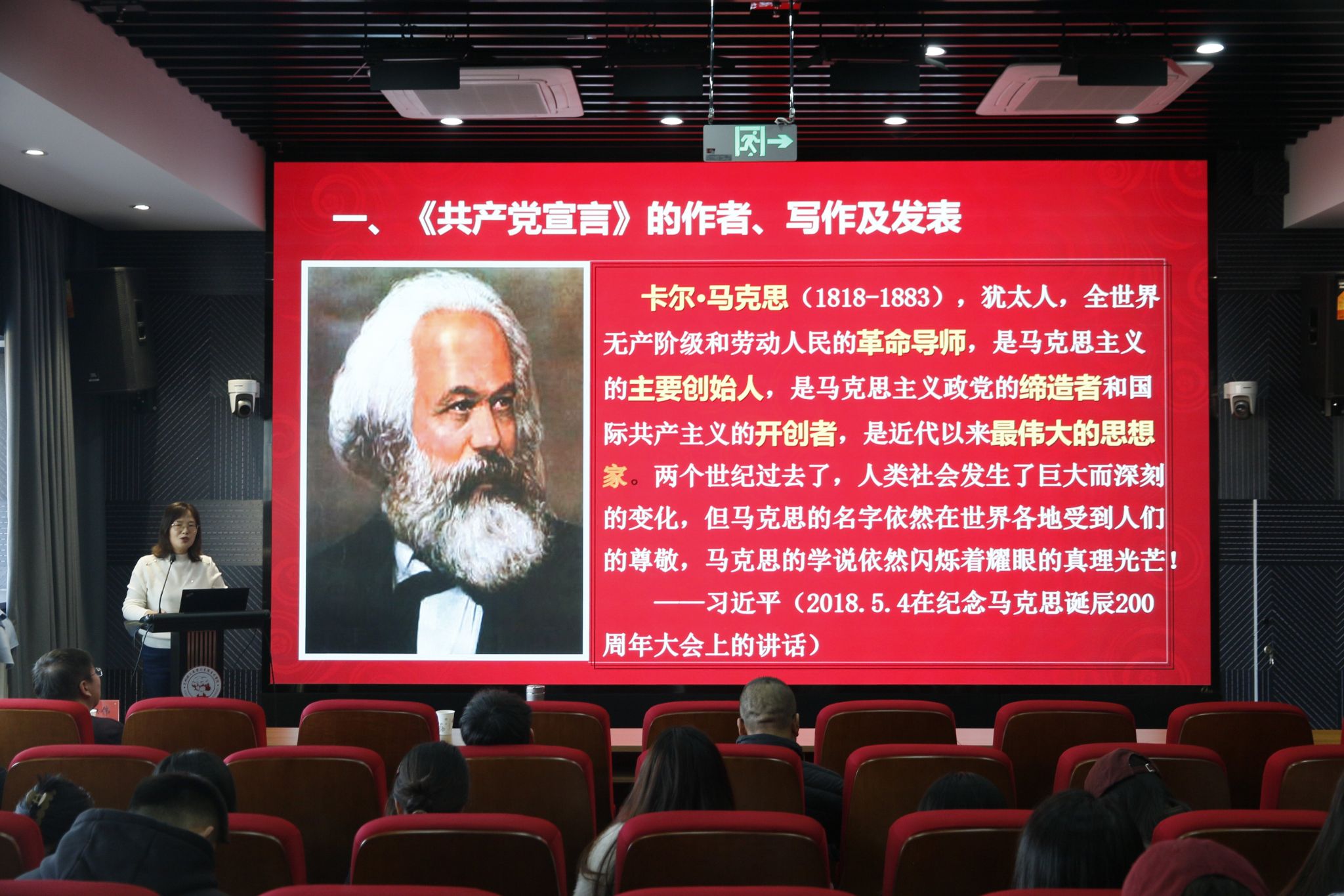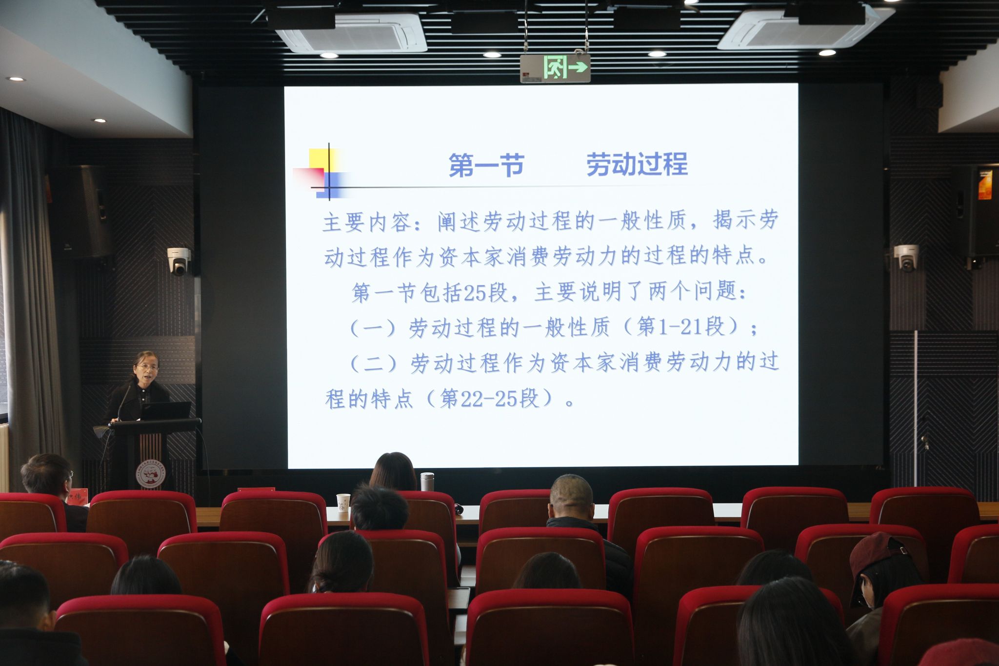 首先,由王海霞教授选取《资本论》第一卷第三篇第五节中关于劳动过程和价值增殖过程,主要涉及到资本主义生产方式。王海霞教授具体展开分析了劳动过程和价值增殖过程,并参照文本进行经典著作的解读,加深同学们对资本主义生产过程的实质,资本家压榨劳动力无偿获得剩余价值的本质等内容的深入理解。随后,由刘海霞教授向我们讲述《共产党宣言》。刘教授从两位作者的传奇人生入手到介绍《共产党宣言》的写作、发表、在中国的传播和发展以及该原著的文本结构,为我们树立了基本的知识架构。最后,刘海霞教授重点强调其中的七篇引言以及四章正文内容,文本“先立后破”,明确共产党人的立场、观点和意图。从正面阐述到反面批判,从理论到实践,帮助同学们更清晰地了解这本“共产党人的圣经”的重要思想理论,也为同学们在接下来研读经典著作的过程中提供正确的方法论引领。