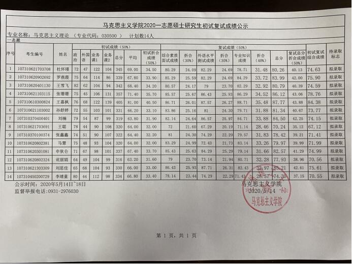 2020年太阳成集团tyc7111cc一志愿硕士研究生初试复试成绩公示