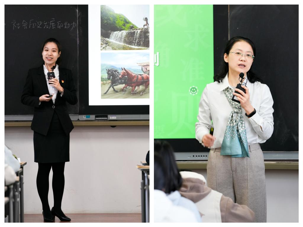 马云霞老师选取《思想道德与法治》第四章第一节《全体人民共同的价值追求》做了示范性讲授课上,马云霞副教授首先带领同学们回顾了前三章的主要内容,随后围绕“什么是价值观”“什么是核心价值观”“社会主义核心价值观的内容”等方面开展示范教学。李婷老师选取《马克思主义基本原理》第三章第二节《社会历史发展的动力》做了示范教学,主要围绕“社会历史发展的根本动力”“阶级斗争、社会革命在社会发展中的作用”“科学技术是第一生产力”等内容进行教学示范